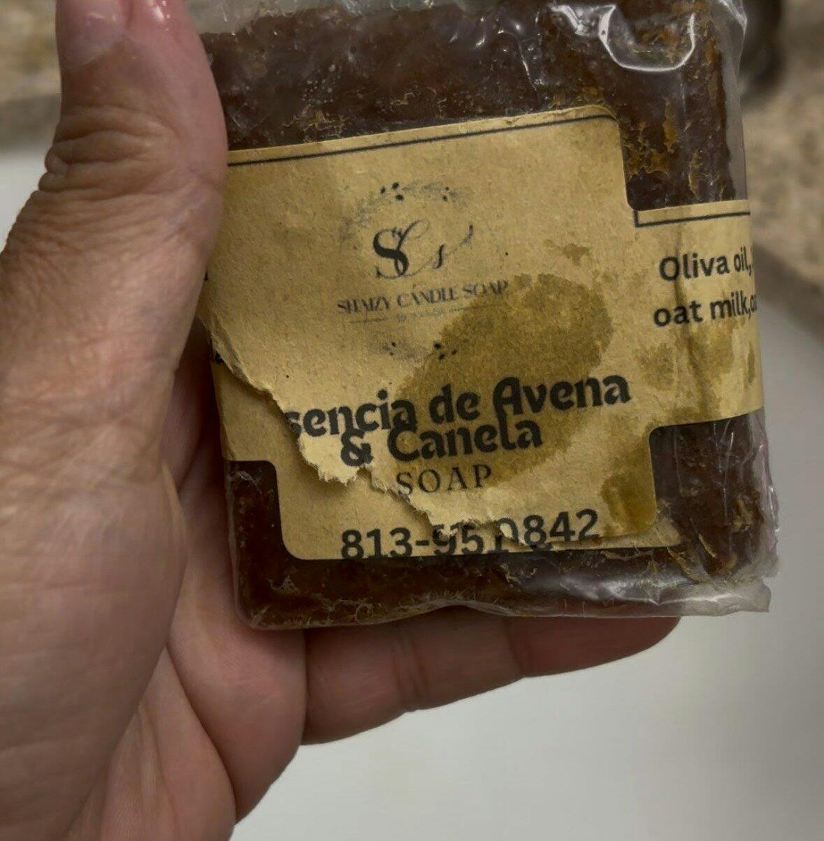 Ingredients: Coconut Oil, Olive Oil, Shea Butter, Lye, Water (substitutes for Oat Milk) and Cinnamon Infusion, White Clay, Cinnamon Oleate, Brown Iron Oxide, Cinnamon Fragrance.